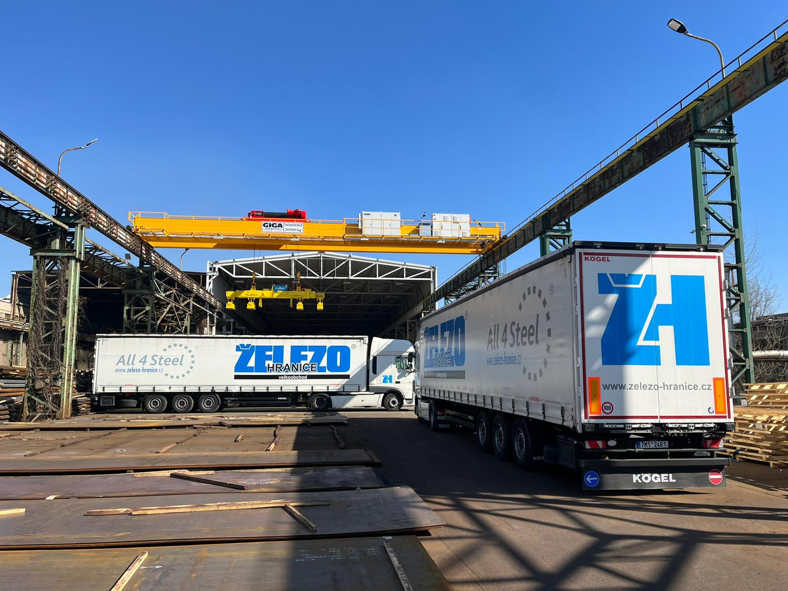 Na našem skladě v Ostravě máme zcela nový 20-ti tunový dvounosníkový mostový jeřáb od společnosti GIGA, na kterém máme novou magnetickou teleskopickou traverzu o nosnosti 15t.